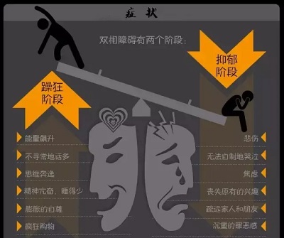 以情绪高涨或低落为主,伴有奔跑或思维迟缓、精神运动兴奋或抑制。躁狂时,患者情绪高涨,与情况不相称。他们可以快乐和激动.激越.忿怒.焦虑,在严重的情况下,可能会有与情绪协调或不协调的妄想.幻觉等精神症状。抑郁症患者心情不好。.苦恼.忧伤到悲观.绝望,不开心,失去兴趣,自我评价低,严重者有自杀观念和行为,病情昼重夜轻。