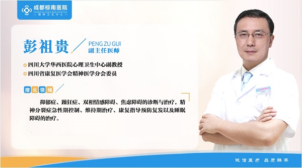 彭祖贵,副主任医师,副教授,1984年毕业于华西医科大学。从事精神医学的临床诊疗,教学与科研工作30余年。参编教科书多部,参与过多项重大科研项目,参与国家级精神药物新药临床试验研究20多项。具有丰富的临床经验和扎实的专业理论知识。擅长领域:精神分裂症、双相情感障碍、抑郁症、焦虑障碍、睡眠障碍的诊断治疗与康复指导。