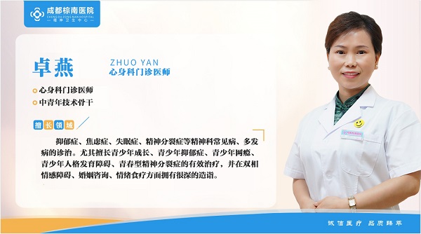 卓燕 医生介绍 心身科门诊医师,中青年技术骨干,擅长抑郁症/焦虑症/失眠症精神分裂症等精神科常见病多发病的诊治.尤其擅长青少你成长,青少你抑郁症,青少你网瘾,青少你人格发育障碍